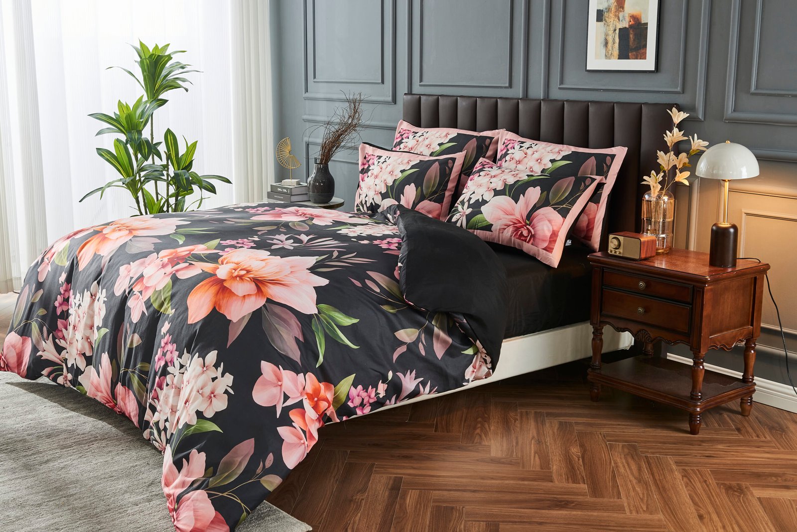 Transform your bedroom into a modern sanctuary with the Sloane Microfiber Duvet Set. A beautifully designed bedding set created to bring comfort, elegance and effortless style to your home. Featuring a striking floral pattern set against a deep, dramatic base, this duvet set adds a touch of luxury while maintaining a warm and inviting atmosphere. The soft colour palette of blush pink, coral and green blends harmoniously with the bold backdrop to create a statement look that elevates any interior décor theme.